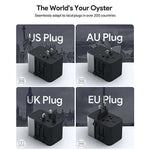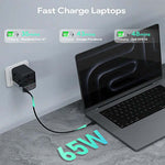 This charger boasts worldwide compatibility, featuring universal plugs for the US, UK, EU, and AU, making it suitable for over 200 countries. Its 65W output supports fast charging for both phones and laptops, while intelligent voltage conversion adapts to different power sources.