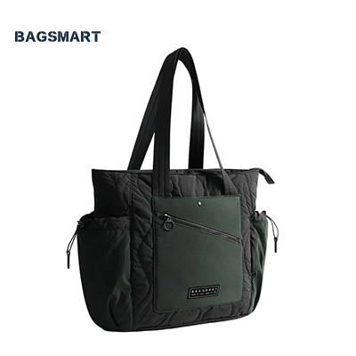 Introducing the Bagsmart Vega Featherlight Tote Bag 23L, the perfect combination of style and functionality. Made with durable, featherweight quilted nylon fabric, this tote bag is designed to withstand daily wear and tear. The exterior features a front pocket with a flat magnetic closure, perfect for storing small essentials. The quick-access front pocket with a zipper and keychain provides easy access to your belongings. The bag also has two side pockets with elastic cords, ideal for carrying water bottles.Inside, you'll find an exquisite peach skin lining that adds a touch of luxury. The spacious main compartment has a 15.6-inch laptop compartment, making it perfect for work or school. The bag also has two mesh zipper pockets, two open pockets, and two pen slots, providing ample space for all your essentials.With a capacity of 23L and weighing only 500g, this tote bag is lightweight and easy to carry. Its dimensions of 15.7' L x 6' W x 14' H make it the perfect size for everyday use. The handle drop of 11' allows for comfortable carrying, whether on your shoulder or in your hand. To keep your bag looking its best, simply spot clean it when needed.Upgrade your everyday bag with the Bagsmart Vega Featherlight Tote Bag 23L. Its sleek design and practical features make it a must-have for anyone on the go. Order yours today and experience the perfect blend of style and functionality.