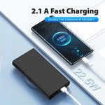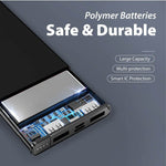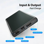 Featuring 2.1A fast charging, this power bank supports dual input and output, ensuring universal compatibility with various devices. It comes with a charging cable and user manual for your convenience.