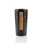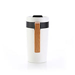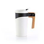 Grotto ceramic mug. A must-have ceramic tumbler. The matt finish body and natural wooden handle are combined by the black coated stainless steel band. Push on, slide-lock lid included. The volume capacity is 475ml. Presented in a gift box.