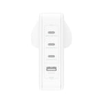 The Belkin 140W 4-Port GaN Wall Charger is an advanced charging solution designed to power a laptop and three additional devices simultaneously. This charger features three USB-C PD ports, ensuring fast charging for all compatible devices, alongside a USB-A port for standard charging needs.