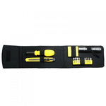 Introducing the Compact Tool Set, a must-have for any handyman or DIY enthusiast. This 14-piece set comes neatly packaged in a sleek black pouch, making it easy to store and transport. The set includes a screwdriver handle, 9 screwdriver bits, a socket adaptor, a tape measure, a cutter knife, and a torch light, providing you with all the essential tools for any project.