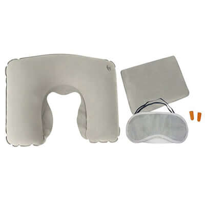 The set also includes a cozy eye mask and earplugs, perfect for blocking out light and noise, allowing you to rest peacefully. The pillow measures 43cm(L) x 26cm(H), while the eye mask is 18cm(L) x 8cm(H). All items come neatly packaged in a stylish velvet pouch, available in blue and grey.