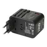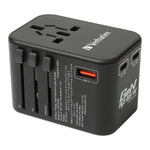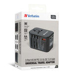 Verbatim 3 Port 65W PD 3.0 & QC 3.0 GaN Universal Travel Adaptor is a compact and portable adaptor that utilizes advanced GaN Technology to provide high power. It comes with 4 built-in international plug types and a full voltage AC universal socket. The adaptor is equipped with 2 Type C PD 3.0 Ports that support up to 65W fast charging when used alone, and 1 USB-A QC 3.0 Port that supports up to 30W fast charging when used alone. It also has a built-in spare 8A fuse for extra protection and comes with a travel pouch for easy storage. The adaptor has multi-national safety certificates and a protection system to ensure safe use.