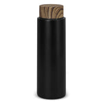 Crafted from durable stainless steel, it features a sleek matte black body complemented by a wood grained water transfer lid. The screw top ensures a secure seal, making it ideal for on-the-go use.