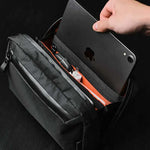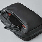 Transforming into a hands-free sling bag, it features a removable crossbody strap for convenience. Made from weatherproof and abrasion-resistant X-Pac VX21 fabric, it includes an accordion-style organization with 12 thoughtfully designed pockets across three compartments. The case stands on its own and has a front quick-access compartment with cable pass-through, ensuring easy access to your tech essentials.