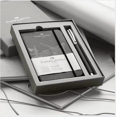 The Faber Castell Notebook and Pen Set is a perfect blend of elegance and functionality. The AMBITION range showcases clarity and a keen sense for materials, featuring barrels made of brushed matt stainless steel and red-brown pearwood.